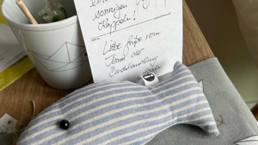 Der Wunsch war ganz klar und mit dem Fischbrötchen in toller Umgebung und schöner Gesellschaft in Claras Gefühl bereits mehr als erfüllt. Die Überraschung, als ihr Enkel Marco samt Verlobter Vivian am Hafen auf sie zukamen, war großartig. Lucie hatte sie informiert, wo sie uns finden. Herzlichkeit scheint in der Familie zu liegen, wir waren sofort alle miteinander „am schnacken“, während wir unseren Stadtrundgang fortgesetzt haben. Kurzer Stopp an der Buchhandlung. Ich hatte im Vorfeld nach einer „Kleinigkeit“ gefragt, einem Becher o.ä., was Clara als Erinnerung mitnehmen könnte. Das liebevoll ausgesuchte und verpackte Geschenk, das sie bekommen hat, hat uns vermutlich alle begeistert. Besonders die handgeschriebene Karte mit den guten Wünschen.