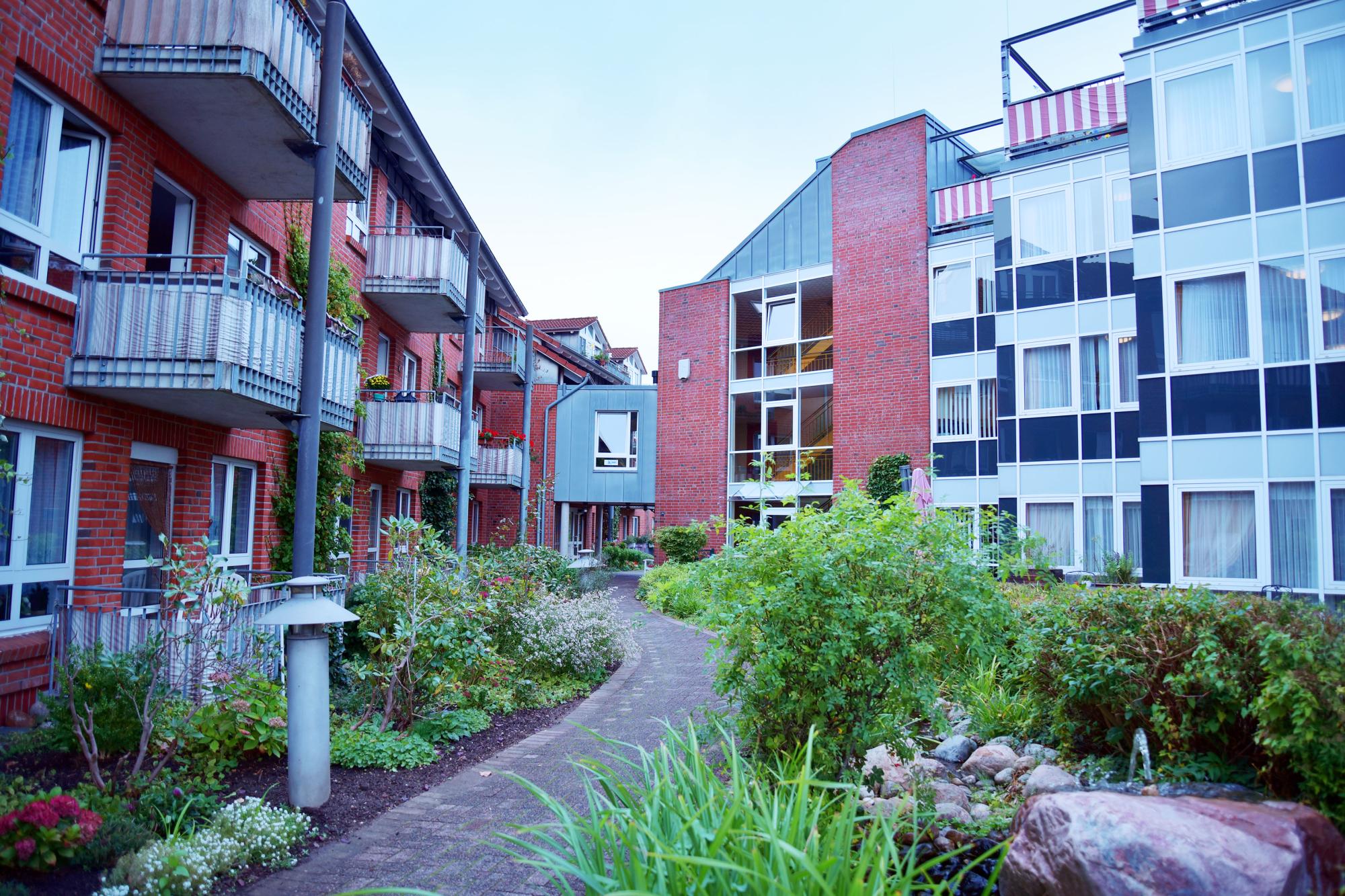 Immer wieder als Segen erweist sich dabei die unmittelbare Nachbarschaft von Betreutem Wohnen und stationärer Pflege. Wer trotz aller Serviceleistungen nicht mehr in seiner eigenen Wohnung zurecht kommt, kann in seiner vertrauten Umgebung bleiben. Auch Ehepaare, die sonst kilometerweit getrennt würden, leben weiterhin Tür an Tür. Für Angehörige ist der stationäre Bereich Tag und Nacht zugänglich, sodass sie sich jederzeit um ihre Lieben kümmern können.